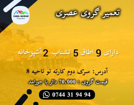 For Sale 6 Newly Built 4 bedroom Modern House for Sale in Karte Naw – Kabul sarak-e-now, Gulistan Street, Karte Naw, Kabul 4 Beds 3 Baths 2 Garages Phone: +93 (0) 765 86 9898 Details ؋4500000 ؋4500000